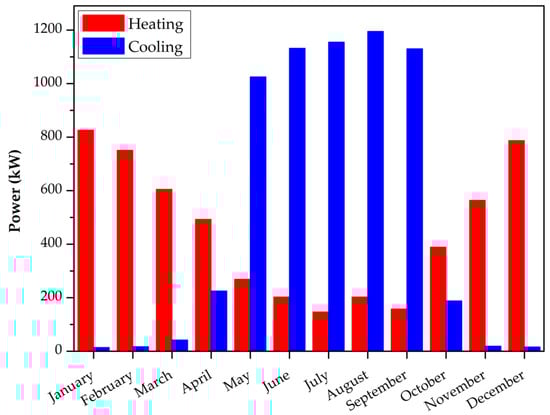 The annual heating energy consumption of the building was calculated to be just over 500 MWh, while the annual cooling consumption was just under 457 MWh. Therefore, the overall annual energy demand of the building for heat conditioning is around approximately 957 MWh. Peak power requirements were determined as 800 and 1000 kW, respectively, for heating and cooling. An analysis of the concurrent heating and cooling power demand is summarized in Figure 1.