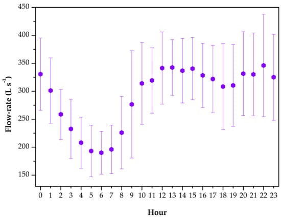 Mean hourly flow rate in the sewer during monitoring in the study year. Bars represent the standard deviations of the data during the observation period.