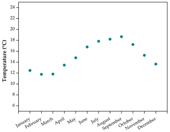 The average temperature recorded during the monitoring period was 15.2 °C, with a minimum of 11.8 °C in February and a maximum of 18.7 °C in September, following the pattern shown in Figure 3.