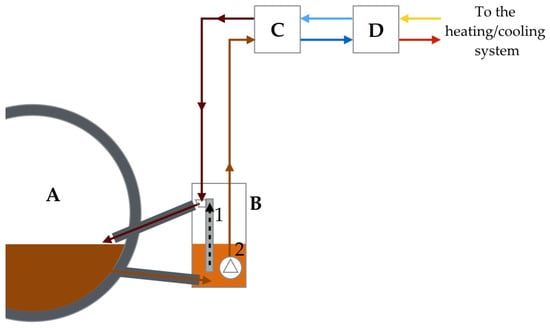 Scheme of the heat recovery system. A: Sewer collector; B: pump with pretreatment (2) and vertical screen (1); C: heat exchanger; D: heat pump. The sewer and pump shaft are underground, while the heat exchanger and heat pump are located aboveground.