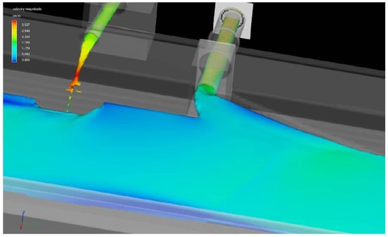 Scheme of the intersection between the inflow and outflow pipes and the main sewer, at a 323 L s−1 flow rate. Reproduced with permission from [28].