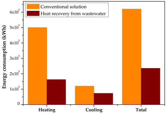 Based on the results shown in Section 3.1 and Section 3.2, the energy requirements in the case of the use of heat pumps and exchangers for wastewater heat recovery are almost 59% lower than those required for a conventional solution. As shown in Figure 7, the option of energy recovery from wastewater could be considered advantageous for both heating and cooling, even though the advantage is more prominent in the former case.