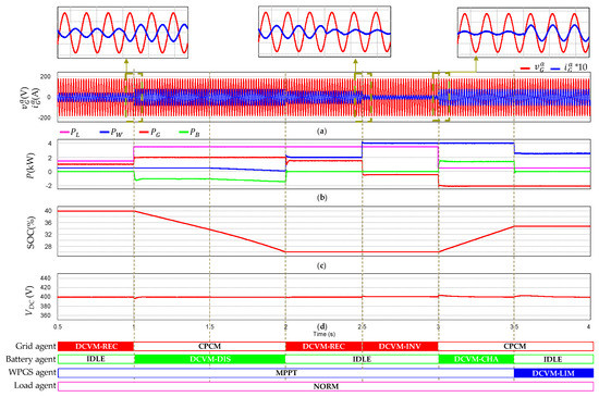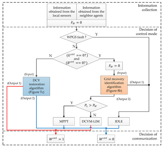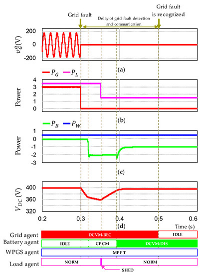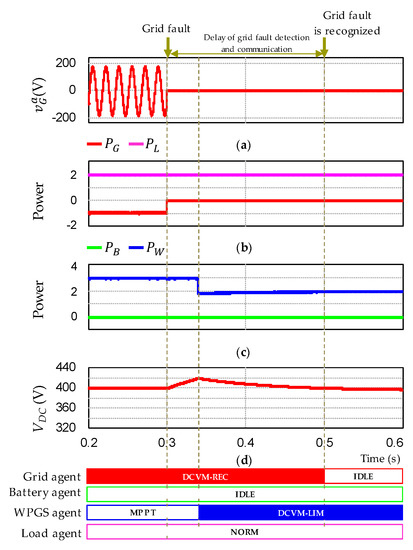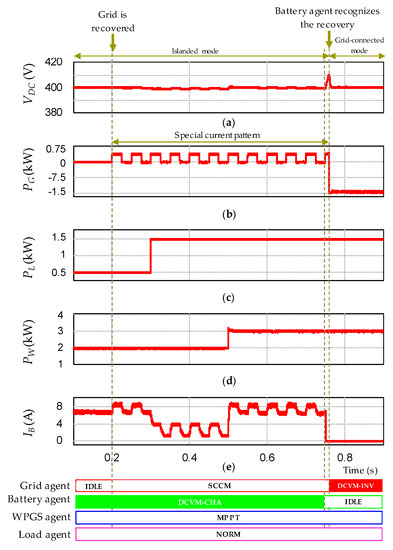- To recognize the grid recovery reliably even under communication failure, the grid recovery identification algorithm is introduced in this study. By detecting the frequency of the current pattern on the DC-link, the battery and WPGS agents can effectively identify the grid recovery even in the presence of communication failure. Therefore, the conflict in the DCV control by different voltage control sources can be avoided.