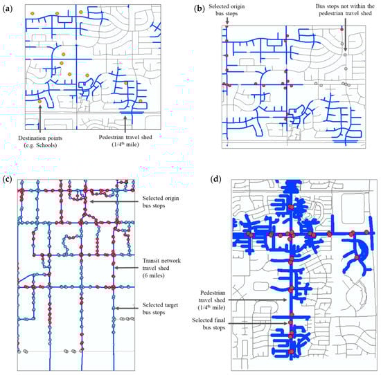 - Run travel sheds starting from each of the destination points to cover one-quarter of a mile distance on the network. This step represents the walk from the bus stop to the final destination, and is illustrated in Figure 1a;