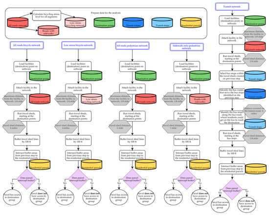 Table 1. Destination groups and data sources. - Networks: The creation of scenarios that allow the assessment of the three transportation modes (pedestrian, bicycle, and transit), regarding compliance with the 20-min city guidelines. The networks were created to simulate five different scenarios within the city. The analysis was conducted for biking on any road, biking on low-stress roads, walking on any road, walking on roads with sidewalks, and for using public transit. Unpaved paths were not considered in any of the analyses, given the fact that in this case study the segments indicated as unpaved were not compliant with the Americans with Disabilities Act (ADA) requirements.