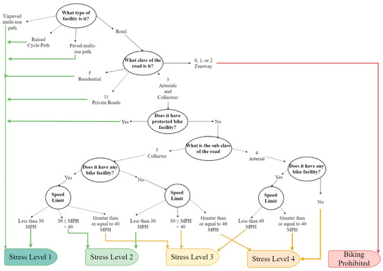 The criteria for assigning stress levels in the case study of the city of Tempe was based on facility type, road hierarchical classification (as a proxy for traffic volume, which was unknown), presence of protected bicycling facilities, and speed limits. Figure 3 details the parameters used to assign stress levels and the hierarchy of decision making.