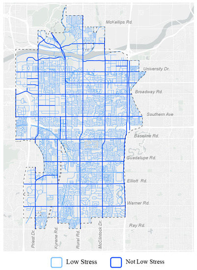 The methodology to identify low-stress biking segments was based on the content provided on the Low-Stress Biking and Network Connectivity Report from the Mineta Transportation Institute (MTI) [23]. The Level of Traffic Stress methodology categorizes road segments into four classifications used to measure the effects of traffic-based stress on cyclists [23]. This methodology was adapted for this analysis. In the Tempe case, road width, median presence (divided roadway), and lane configurations were not considered as data was unavailable. Intersection approaches or intersection crossing were also not considered. These issues are returned to in the Discussion section below.
