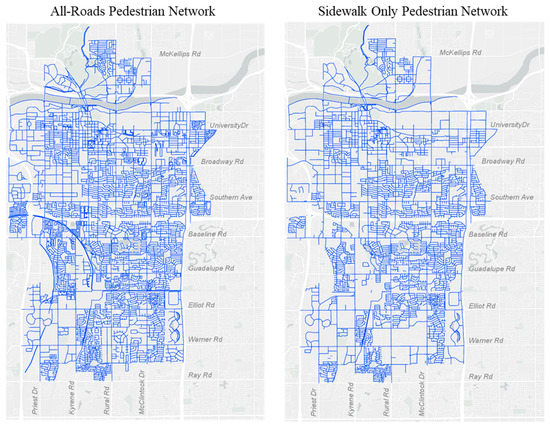 The sidewalk-only pedestrian network was a subset of the all-roads pedestrian network. It considered only segments with sidewalk present on at least one side of the road. Figure 5 compares the all-roads pedestrian network and the sidewalk only pedestrian network. Information on sidewalk availability on private roads was not available. Some apartment complexes, especially on the south part of Tempe, were not considered in this analysis, since their sidewalks are not managed by the city. The network analysis parameters were the same as for the all-roads pedestrian network: One-eighth of a mile accepted from the destination to the network, and travel sheds of one mile.