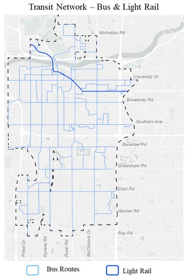 Previous accessibility studies have created tools to measure how well a city is connected to opportunities—for examples, see References [21] or [22]. However, there was a lack of structured methodology to specifically assess compliance with the 20-min city concept being introduced in the City of Tempe. This paper describes a case study using the following method.