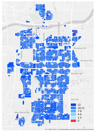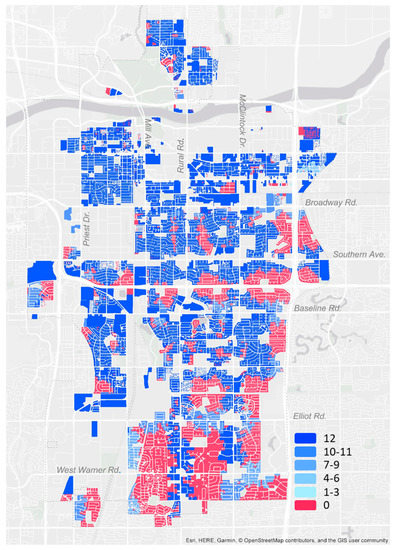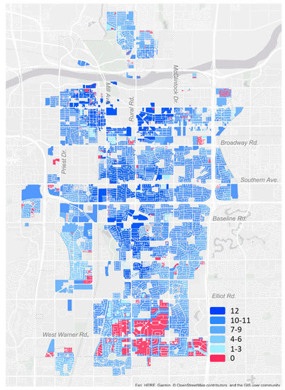 Figure 10 shows how many destination groups each parcel could reach within twenty minutes of walking only on roads with sidewalk present on at least one side of the road. This scenario showed the lowest levels of accessibility across the studies shown on this manuscript. A large portion of South Tempe appears on Figure 10 as having no access to any of the twelve destinations. South Tempe is characterized by single-family homes, and residential complexes of with private roads. The lack of information on sidewalk availability on private roads was reflected on the methodology proposed in this manuscript. The remainder of the city showed decreased accessibility levels in comparison with the assessments for pedestrians walking on all roads. Smaller areas continued to exhibit access to all twelve destinations, such as north Mill Avenue, north Rural Road, and the surroundings of Rural and Baseline Roads.
