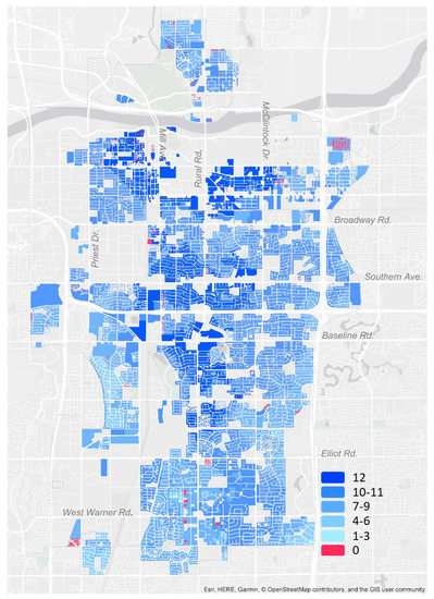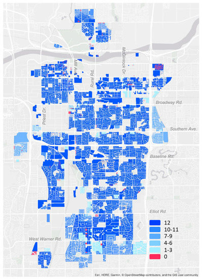 Tempe is located within the Phoenix metropolitan area and has about 190,000 people with a density of about 1850 people per square kilometer [20]. It borders the city of Scottsdale to the north, the city of Mesa to the East, the city of Chandler to the south, and the city of Phoenix to the West. Tempe is shaped roughly like a rectangle running north-south. Downtown Tempe is in the northern end of the city, bounded on two sides by the Arizona State University (ASU) campus and Tempe Town Lake. The downtown area is a mix of commercial and residential, with ample multi-family housing and rentals that cater to professionals and students. The growth of the city since the middle of last century has spread south from the historic downtown core. The further south it is, the more likely the city is to feature uni-functional land uses of single-family homes on cul-de-sacs. This geography of the city matters for the understanding of the 20-min assessment as discussed below.