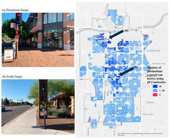 Number of destinations accessible within 20-min by all 5 network analyses, and examples of intersections in Downtown Tempe and South Tempe.