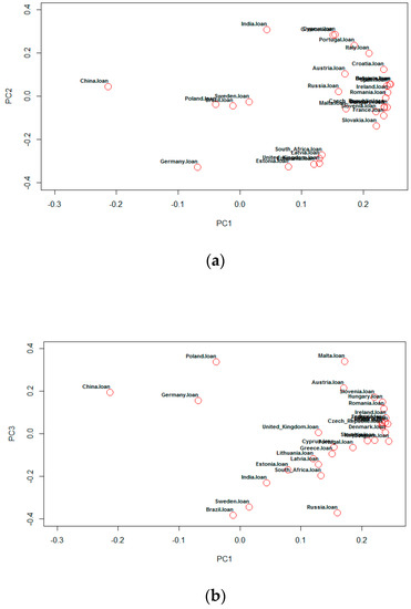 Subsequently, we applied the same method to the government-to-GDP ratio data, and the results are demonstrated in Figure 3a–c. These figures are the scatter plots of the 30 countries’ government-to-GDP data in the principal component (PC1, PC2 and PC3) plane.