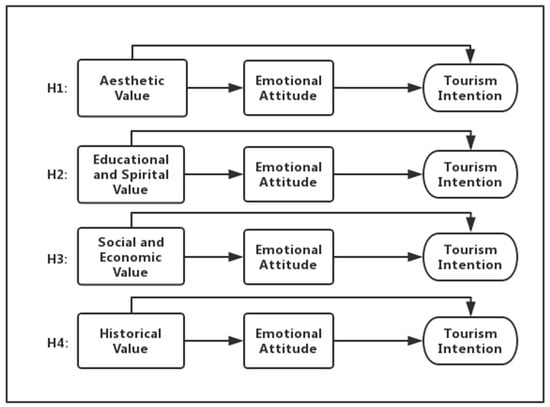 According to the literature review and research design, we postulated that residents’ value cognition around TFTLC would positively influence their tourism intentions. Specifically, emotional attitude was expected to play a mediating role in the relationship between the four value cognition indicators and tourism intention. Hypotheses H1, H2, H3 and H4 are proposed as follows, and depicted in Figure 1: