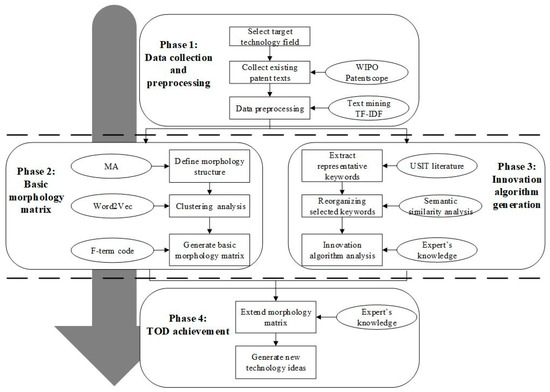 Valuable contributions have been made to the development of MA, and the major research stream lies in its application. MA has been applied to the design of materials and products in computer-based design [27,28], the development of new services [29], technology forecasting (TF) [30], TOD [15], and the generation of business models [31]. However, MA has the defect of inability to perform in a stand-alone mode. To systematize and automate the process of building the morphological matrix, other approaches have been used as a facilitator in the process of TOD. For example, text mining has been widely used to extract valuable information from the large volume of data by extracting keywords from patent documents [10,25,32] and selecting appropriate shapes based on the frequency and co-frequency of each word [5]. As a supplement, software tools have also been developed and applied to support the execution of MA [33].