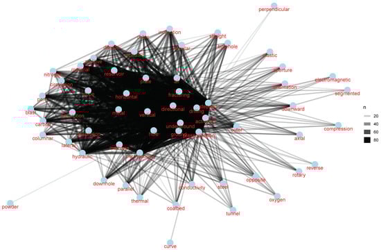 To deal with the ambiguous relation of the values from different patent documents, all of them are transformed into a keyword vector and then clustered into 40 groups by the Word2Vec algorithm. For example, “discharge” and “outlet” are close to each other. With this, the values with similar meanings are grouped into the same cluster, as illustrated in Figure 2. The full result of word vectors is presented in Appendix A. The line between each associated word represents the semantic proximity. The darker the colour is, the closer these two words’ semantics are. The values in each cluster can be explained by a few dimensions with the guidance of domain experts. To make the connection between dimensions and values clear, values are first assigned into sub-dimensions, the concepts of which are subsidiary to the dimensions in Table 2. Each keyword has a specific value in the technology, which is developed by F-term and domain experts. F-term theme and viewpoint are extracted from the JPO database. Hence, the morphology of coalbed methane extraction is presented in Table 2. There are three innovation dimensions for coalbed methane extraction, including the mechanism dimension, space dimension, and material dimension. The technology can be structured in a multidimensional view according to the analysis of sub-dimensions and values. Moreover, Table 4 lists the definitions of dimensions that are used to illustrate the technology morphology.