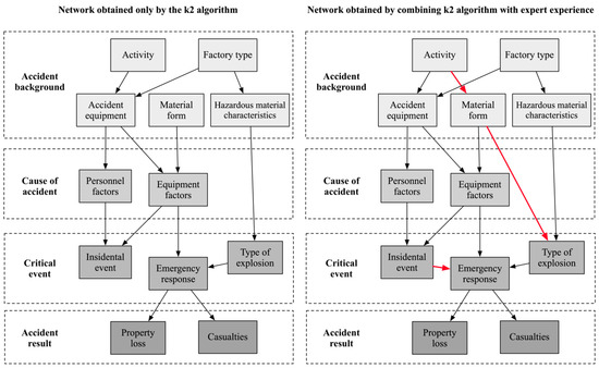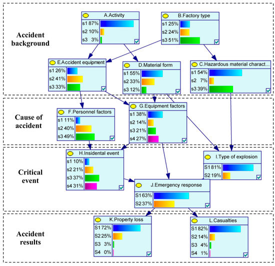 Since the weight of the causal relationship between two nodes is larger than the threshold value (0.85), the causal relationship exists. We add connections between nodes, such as the relationship from the “Activity” to the “Material form,” “Material form” to the “Explosion type,” and “Incidental event” to the “Emergency response.” The K2 algorithm does not learn these three relations, but we have added expert knowledge to ensure the accuracy of the network. The final Bayesian network of chemical plant explosion accidents is in Figure 2.