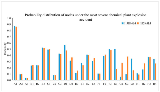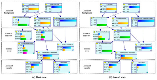 Fast and efficient response are essential to decrease property loss and casualties of accidents. To assess the impact of emergency response, we present evidence of two different states in the “Emergency response” (J1 and J2). Before this, our evidence for the nodes in the “Accident background” and “Cause of accident” is: We set all pre-nodes to the most prone to the normal situation (maximum probability). (a) Set activity to A1 (Use and run); (b) Set factor type to B3 (Basic chemical); (c) Set “Material characteristics” to C3 (Toxic and harmful); (d) Set “Material form” to D1 (Gas or gas-liquid mix). The final inference results for “Casualties” and “Property losses” are shown in Figure 7.