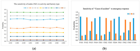 We attempt to explore the impact of various types of operations carried out in different plants on emergency response, property loss, and casualties, as this will help managers to develop management strategies and reduce the risk of explosion. As shown in Table 4 and Figure 5a, sensitivity studies are conducted by setting nine different cases (A1B1~A3B3) and find that the impact of activity and factory type on the “Accident results” is minimal. Most of the probabilities are floating within 0–1%, with less impact. However, when the activity state is A3 (Overhaul or clean) and the state of factory type changes, the probability of effective response changes by nearly 3%, this shows that different chemical plants have different levels of J1 (effective response) when conducting A2 (transportation). This finding is a hard-to-find feature, but it sounds interesting.