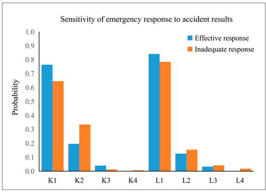When we change the state of “Emergency response” from J1 (Effective response) to J2 (Inadequate response), the probability of K1 (Loss of fewer than 10 million yuan) reduces from 76% to 64%, the probability of K2 (10–50 million yuan) increases from 19% to 33%. When it comes to casualties, the probability of L1 (1 to 3 deaths) is 84% in J1 (Effective response), while in the case of J2 (Inadequate response), the probability of L1 (1 to 3 deaths) is reduced to 78%, because more probabilities transfer to the L2 (3–10 deaths), which increases from 12% to 15%. The results show that “effective response” plays a vital role in reducing the casualties. If we set the property loss and casualties to the maximum (K4 and L4), we found the probability of J2 (Inadequate response) was 98%, which also illustrates the importance of an effective response. If property loss and casualties are reduced by one level (K3 and L3), there is an 82% probability of inadequate response. However, we found that if we continue to decline by one level (K2 and L2), the probability of an effective response increases to 62%. The above explains that an inadequate response will lead to the most serious results and will also make less severe results more serious. As long as an effective response is achieved, casualties and property losses will remain at a low level.