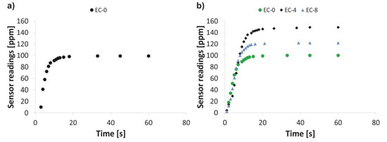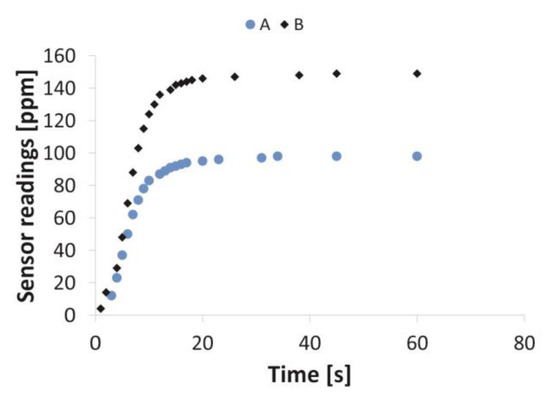 The electrochemical CO sensor response time was shorter than its characteristics describe. Similar times were reported in the studies of Yan and Liu, where the time for a response to a step change of CO equaled ca. 3 s [31]. This is due to the way that gas is supplied directly from the cylinder.