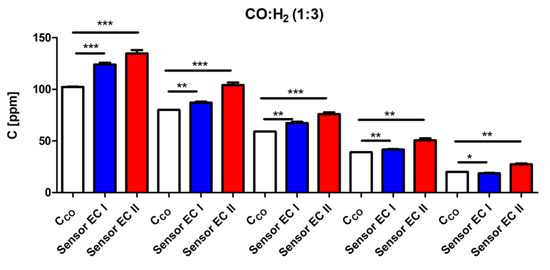 Concentration measured in set conditions (CCO) by sensor I (EC I) and sensor II (EC II) when the CO:H2 relation was 1:3. Data presented as mean ± standard error, n = 5. T-student test. * p < 0.05; ** p < 0.01, *** p < 0.001 vs. CCO.
