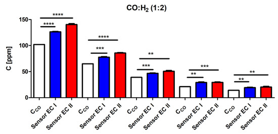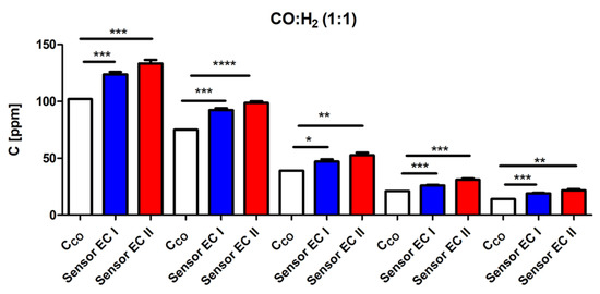Concentration measured in set conditions (CCO) by sensor I (EC I) and sensor II (EC II) when the CO:H2 relation was 1:1. Data presented as mean ± standard error, n = 5. T-student test. * p < 0.05; ** p < 0.01, *** p < 0.001, **** p < 0.0001 vs. CCO.