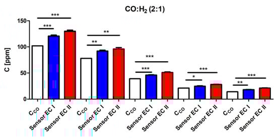 Concentration measured in set conditions (CCO) by sensor I (EC I) and sensor II (EC II) when the CO:H2 relation was 2:1. Data presented as mean ± standard error, n = 5. T-student test. * p < 0.05; ** p < 0.01, *** p < 0.001 vs. CCO.