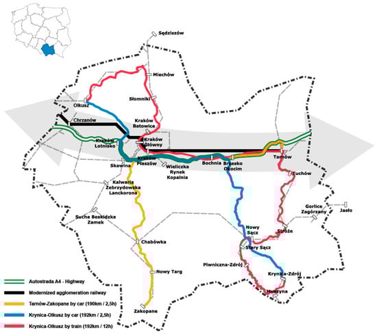 Sustainable urban development—the application documents indicated that other large cities of the Lesser Poland Voivodship will take part in organising the games. In this situation, various stadiums can be located as far as 200 km away from each other (Krynica-Olkusz 193 km, Tarnów-Zakopane 179 km), which will generate the necessity of additional transport, which has been indicated as one of the main factors affecting carbon footprint in practically all reports, leading, as a consequence, to the deterioration of the environment. The existing network of public transport connections is slow and cannot compete with individual modes of transport (as demonstrated in Figure 1, the distance between Krynica and Olkusz can be travelled in 2,5 hours by car; the same trip can last between 12 and 16 hours by train and requires several transfers). Only cities along the A4 highway and the modernised railway line (the Tarnów→Krakow→Chrzanów link), that run along the East–West direction, can be considered to have proper circulation between them. The links with cities to the North and South of this axis require comprehensive remodelling.