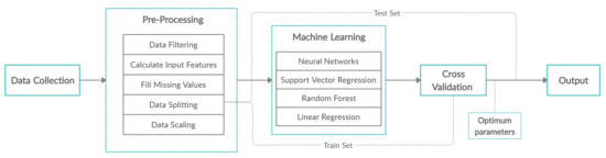 The main scope is the comparison of four machine learning algorithms—Neural Networks, Support Vector Regression, Random Forests, and Multiple Linear Regression—that will predict the traffic status in the city of Thessaloniki. In this section, we describe the data we collected from the streets of Thessaloniki, the pre-processing steps, and the features that comprise the training data, as well as the machine learning models, their optimization, and the evaluation metrics, as shown in Figure 1.