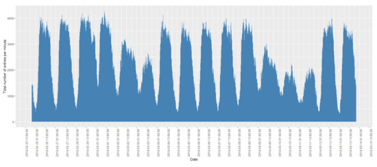 An example of the distribution of the FCD records for every 15 min over a period of 2 weeks is shown in Figure 2. A peak was observed before midday every day, which was reduced slowly after midday. In addition, there was a significant reduction on weekends (2–3 March, 2019 and 9–10 March, 2019) and public holidays (11 March, 2019 was Clean Monday, which is a public holiday in Greece and Cyprus).