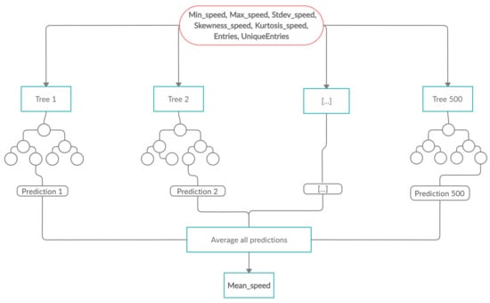 In order to implement an RF, two R packages were used—caret [33] and randomForest [34]. By using the training set data and performing 10-fold cross-validation, the best combination of the number of trees () and the number of variables available for splitting at each tree node () were selected; the best model was trained and was used to predict the speed in the test set. The RF builds multiple decision trees and averages their predictions (Figure 3). Despite the high variance each tree might have, the entire forest will have lower variance and, therefore, the predictions of the speed will be more accurate and stable.