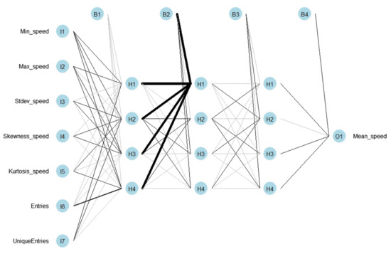 Multilayer perceptron (MLP) [38] is a feedforward Artificial Neural Network (ANN) model that can deal with non-linearity. MLP consists of a number of layers: The input layer, hidden layers, and the output layer. The input layer, which consists of seven nodes, receives the inputs, which are then moved forward through the MLP by taking the dot product of each layer with the weights of the following layer. This dot product results in some values that are then passed through an activation function—specifically, the logistic activation function—for all the layers except the output where the linear activation function is applied. The process is repeated for the next layers until it reaches the output layer that consists of one node; that is the predicted value of the mean speed. Each layer is fully connected to the next one. During the training process of the model, i.e., the updating of the weights, the output is compared to the real value and an error is calculated. This error is then propagated back through the network with the use of the resilient back propagation (Rprop) algorithm, which is often faster than training with back propagation and focuses on eliminating the influence of the size of the partial derivative on the weight step. Therefore, only the sign of the derivative is considered for the indication of the direction of the weight update; the updated value determines the size of the weight change [11]. The TrafficBDE package was used in order to build and train the appropriate MLP models [29]. By using 10-fold cross-validation, different combinations of the number of neurons in each hidden layer are tested in order to select the model with the lowest error and train it to predict the mean speed (Figure 4).