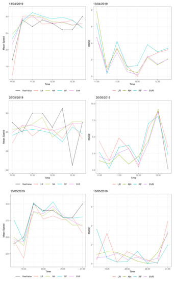 Figure 6 shows the RMSE of the four models. In this scenario, there was one abrupt change in speed at the start, middle, and end of the examined two hour time. Large RMSE values occurred at 13 April 2019 and at 20 May 2019, where there was an abrupt change in average speed of around 10–15 km/h. All models tried to follow this change, achieving RMSE values at 5–8 km/h, which is large considering that the other predictions of these time windows have RMSEs less than 4 km/h. However, on 13 March 2019, all models performed better with a change of speed at 5 km/h where the RMSE was less than 4 km/h. Specifically, in most cases, the Neural Network and SVR models performed better in terms of RMSE, and the linear regression model was often influenced by abrupt changes, leading to greater error.