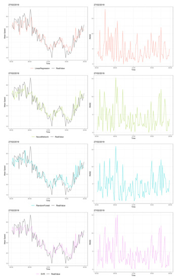 Figure 7 shows the traffic speed distribution of one random road on 27 February, 2019, when there were frequent and abrupt changes of speed. Before 06:00, average speed levels fluctuated between 40–50 km/h; the models tried to follow the changes in speed. LR and RF had RMSEs of almost 15 km/h. After 6:00 a.m., the average speed decreased by 20–30 km/h, meaning that there was an increasing number of cars in this road. At this time, all models had their maximum RMSEs, which were around 15 km/h. For the rest of the day, LR and RF had large RMSE values when there were large and abrupt deviations in speed, whereas NN and SVR showed better performance with the minimum MAE and RMSE values and the minimum of maximum errors, as shown in Table 2.