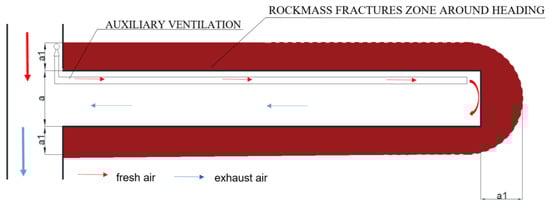 During the mining process related to mined (excavated), dog headings are usually “the blind”. The dog heading has one connection with the main airways in underground ventilation systems (Figure 1). This makes it very difficult to properly ventilate them, especially because in the face of such heading and along their entire length, there are employees who operate the mining machinery and machines that protect the heading. The presence of the crew and the highly specialist, and hence very expensive, equipment makes it necessary to provide adequate ventilation to such headings. The ventilation system must ensure proper temperature and chemical composition of air, so that the employees could freely and safely perform their work [6,7,8,9,10,11,12,13,14,15].