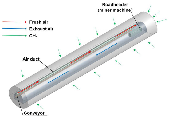 To prevent dangerous accumulation of methane and ensure proper composition of the atmosphere in excavated dog headings, a ventilation system with an air duct is commonly used to supply fresh air to the face of the headings (Figure 1). The parameters of the air supplied are selected depending on the geometric parameters of each heading, the temperature, as well as the anticipated level of methane emission.