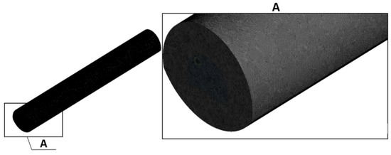 Next, discretization of the model was performed, involving generation of a triangular mesh. The mesh consisted of 91,656,136 elements, whose size amounted to 0.05 m (for the part of the model reflecting the air duct and the conveyor, the size of the mesh was 0.01 m). Fragment of the discrete model of the heading is presented in Figure 5.