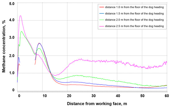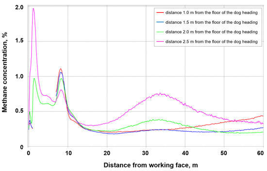 Given that the measurement accuracy of the automatic methanometry sensor is 0.1%, it can be assumed that the model developed, which is nevertheless a kind of simplified reproduction of the actual heading and fractures zone, shows great convergence with the measurement results in real underground coal mines conditions. This shows that the real system under analysis has been well reproduced in the numerical model.
