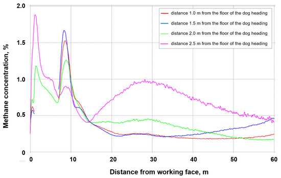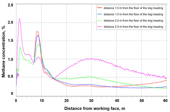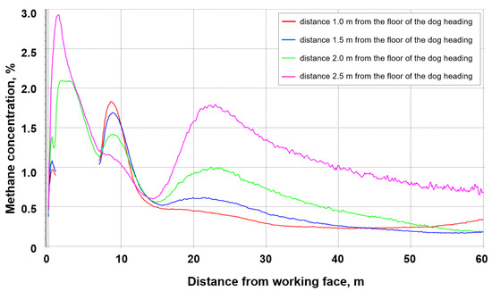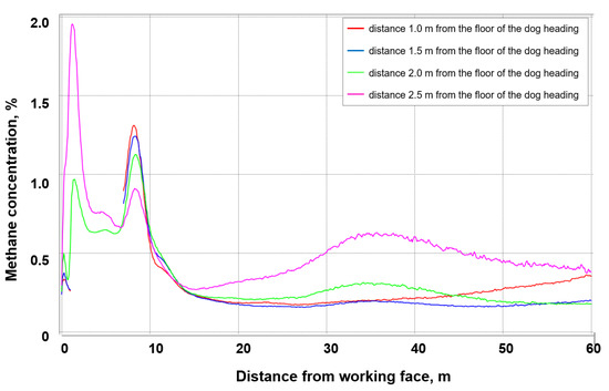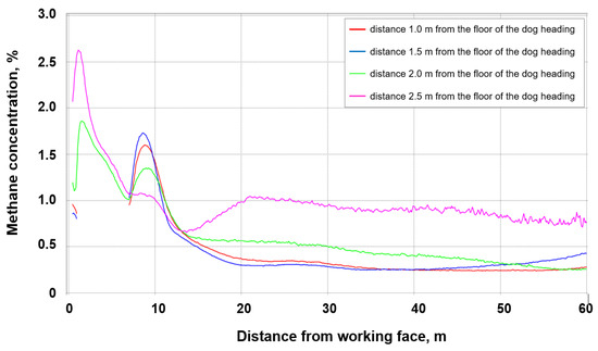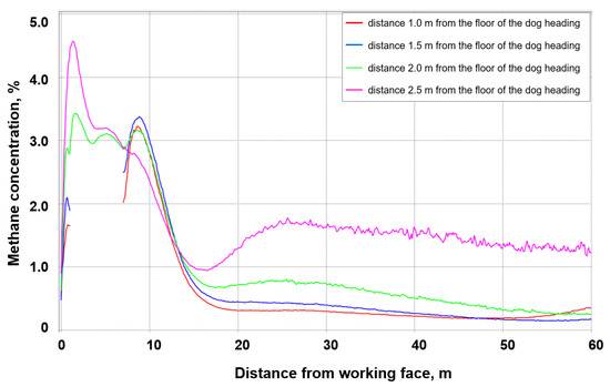 Another important point is that large permeability of the fractures zone has practically no influence on the concentration and distribution of methane in the face area of the excavated dog heading (in the area of excavating the front of the heading). This impact is particularly important beyond the mine face area, at a distance of approx. 20–25 m from the front of the face.