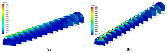The results presented should also be used to properly localize the sensors of automatic methanometry. They should be located in areas where the highest methane concentrations are expected. The results obtained indicate that these areas should be practically selected for each heading individually. This is because a change in the heading’s geometry, as well as in the mining and geological conditions in which the heading is made, affects the different distributions of methane concentration.