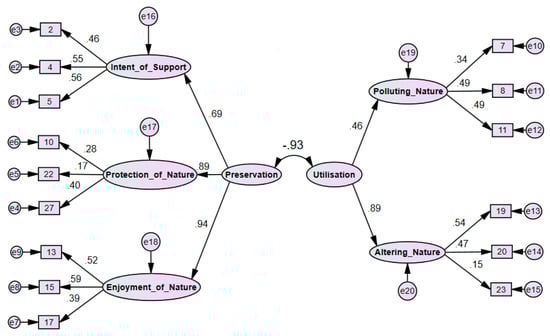 All three items (7, 8 and 11) under attitude 4 were developed for this study. These three items share a common trait of polluting nature. Thus, attitude 4 was named Polluting Nature. The intent of these items demonstrates pollution related to the utilisation of natural resources, for example, bathing in the river with a soap. Similarly, items 19 and 20 were adopted from the attitude Altering Nature from the previous 2-MEV studies. Likewise, item 23 also focuses on altering the course of nature. Thus, attitude 5 was named Altering Nature. Finally, the PCA and CFA validation process resulted in a two-dimensional model of 2-MEV for rural Nepal. The existence of both dimensions, Preservation and Utilisation, in the 2-MEV Scale is its most significant advantage over other psychometric tools, as remarked by Boeve-de Pauw, Van Petegem and colleagues [,,]. These two values are also in line with the current intergovernmental agenda of sustainable development goals []. Figure 1 presents the validated model of 2-MEV Scale for rural Nepal.