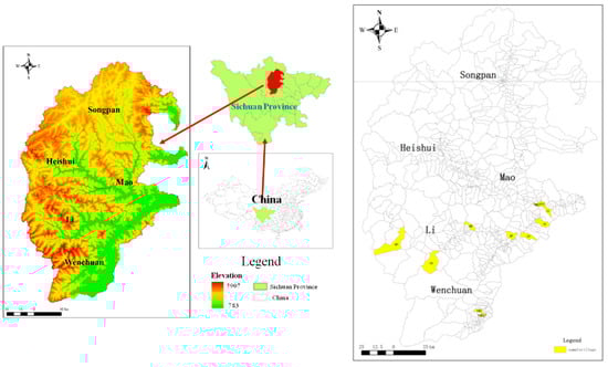 Furthermore, based on the sixth census of China (2010), the total population in the upper Minjiang River basin is 385,200 [], with major population distribution in river valleys and mountain terraces. With the advantages of transportation and location, Wenchuan County and Maoxian County gather more than half of the total population of the upper Minjiang River basin, with the population in Li County the smallest. Meanwhile, the topographic conditions and ecological vulnerability in these three counties were more complex. We chose villages in these three counties as sample villages.