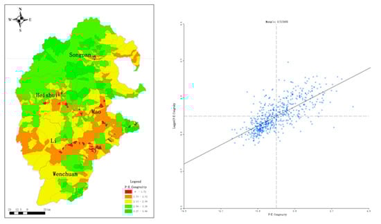The univariate Moran’s I analysis gave a Moran’s value of 0.52, meaning the human–environment congruity of the upper Minjiang River basin was positively spatially correlated. According to Moran’s scatter plot (Figure 4), the main cluster type was high–high cluster (a village with high value of human–environment congruity was surrounded by villages also having a high value of human–environment congruity) and low–low cluster. There were 205 and 280 villages belonging to first quartile and the fourth quartile, respectively, accounting for 33.89% and 46.28% of the total villages. There were only 72 and 48 villages belonging to the second quartile (low–high cluster) and the fourth quartile (high–low cluster), accounting for 11.9% and 7.93%, respectively.