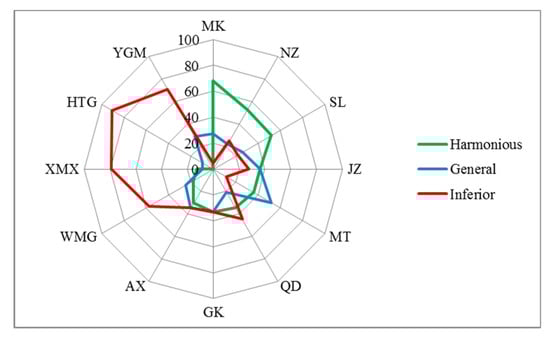According to the subjective evaluation (Figure 5), the 12 villages were divided into four categories. MK, NZ, and SL were the first category. The percentage of harmonious was highest in these villages, accounting for 68.18%, 52.78%, and 52.17%, respectively, all exceeding 50%. JZ, QD, GK, and AX were in the second category. The proportion of different types (harmonious, general, and inferior) was equally distributed in these villages, all around 30%. MT was the third category. The percentage of ‘general’ was highest (more than 50%) while ‘inferior’ was lowest (around 10%). YGM, HTG, XMX, and WMG were the fourth category. In contrast to the first category, the percentage of inferior was highest in these villages, accounting for 70.83%, 90.47%, 79.17%, and 57.14%, respectively, all exceeding 50%.