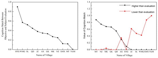 According to the MD (match degree) value (Figure 6), HTG village was highest, with a value of 0.9, while YGM village was lowest with a value of 0. There were three villages in which the MD was higher than 0.5. Six villages had a MD between 0.2 and 0.5. Three villages had a MD less than 0.2. One village belonged to Match-H (SL village) and two villages belonged to Match-L (HTG village and YGM village).