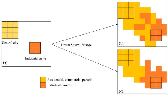 The analytical graph of the urban sprawl process in China. (a) The urban spatial pattern before rapid urbanization; (b) industrial parcels surrounded by residential parcels after urban sprawl; (c) industrial parcels nearby to residential parcels after urban sprawl.