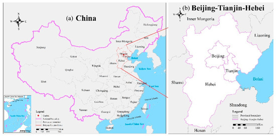 The location of the Beijing–Tianjin–Hebei urban agglomeration. (a) The location of the study area in China; (b) the Beijing–Tianjin–Hebei urban agglomeration.