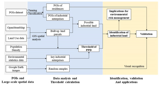 In this paper, we propose a method of fast identifying industrial land parcels using POIs and large-scale spatial data, including OpenStreetMap (abbreviated as OSM), population density, and land use data, etc. (Figure 3). The built-up land parcels are generated by the OSM and land use data. The POIs data are classified by industrial and residential types after cleaning, and then used to identify the possible industrial land parcels. We calculate the parcel population density (abbreviated as PPD) thresholds using environmental statistic data, which were officially released. Using the PPD, we can fast identify the industrial parcels from all the possibilities. The results can be validated by the random samples. Using the results, we discuss implications for environmental risk management in this area.