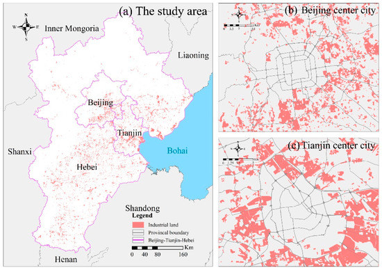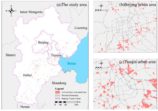 The industrial land parcels where soil contamination risk suggests key monitoring and remediation. (a) The study area; (b) Beijing urban area; (c) Tianjin urban area.